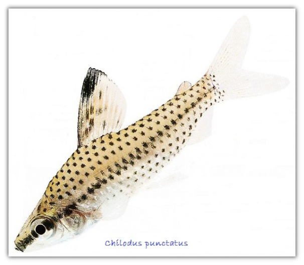 Questa specie viene anche comunemente chiamata Chilodo maculato. Lo possiamo trovare in natura nei corsi d'acqua dell'Amazzonia e della Guayanica. Ha la caratteristica di essere timido, quindi necessità di nascondigli negli acquari, che si creano mediante legni e radici. Gradisce una illuminazione tenue. Va specificato che nonostante abbia una dieta onnivoro, preferisce i vegetali e un'acqua non dura. La sua caratteristica è la modalità che sviluppa nel mangiare; il pesce bruca. Per soddisfare questa caratteristica particolare, possiamo sbriciolare i fiocchi vegetali e inumiditi, cospargerli sulla roccia; una volta essicata può essere riposta nell'acquario. La forma del suo corpo è allungata dal colore argenteo con macchie scure su tutto esso; durante il periodo della riproduzione queste stesse si ingrandiscono . Ha una linea scura che partendo dal muso attraversa l'occhio e raggiunge l'opercolo. Ha una fronte molto sporgente, con la testa appuntita. Ha sulla pinna dorsale una grossa macchia e una piccola pinna adiposa. La sua dieta è onnivoro con livelli di noto centrale e inferiore. Il suo temperamento è pacifico dalla caratteristica di timidezza. Ha una dimensione adulta di 10 cm.